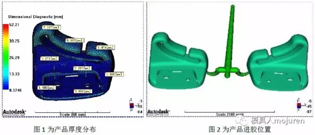 此產(chǎn)品為汽車(chē)安全帶固定件: 產(chǎn)品最大外形尺寸:70*45*63,產(chǎn)品平均肉厚:1.8~7.0mm,產(chǎn)品肉厚差異較大,因此采用3D網(wǎng)格分析,如圖1所示。材料:ABS+PA6-GF8 Terblend N NG-02 : BASF .此材料已做修正,質(zhì)量指示器為銀級(jí),此材料可信度較高。 模具為一模兩件,由于產(chǎn)品量大,因此進(jìn)膠方式為冷流道隧道澆口進(jìn)膠,如圖2所示。